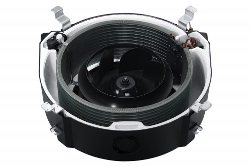 Иновативният бустер вентилатор позволява навлизането на студения въздушен поток под много по-малък ъгъл. Той създава зона на ниско налягане около отвора, така че студеният въздух да излиза успоредно на тавана и да се разпространява в по-обширна зона по-бързо.